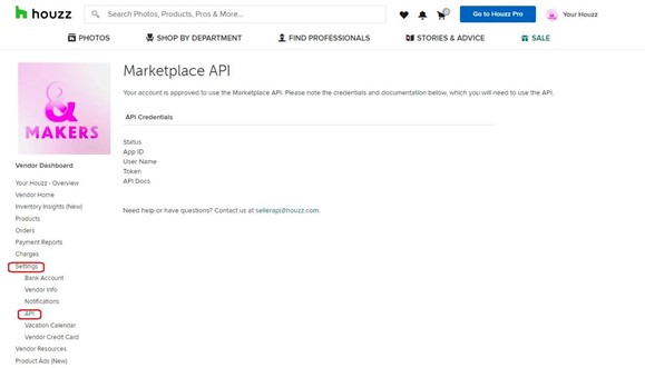 4.) Once you click on the Vendor Dashboard, click “Settings” and click API.