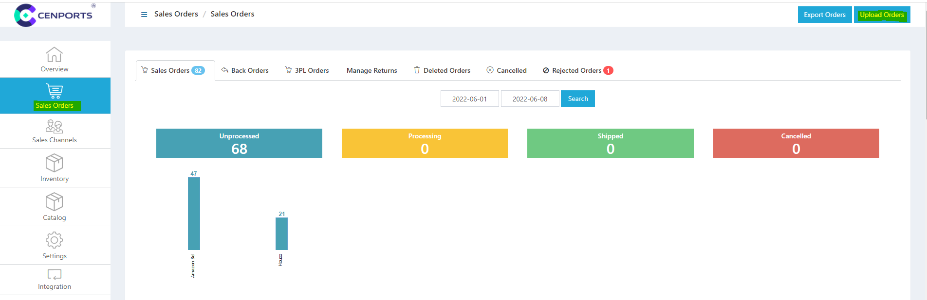 2. Click Sales Orders on the left navigation side then click Upload Orders.