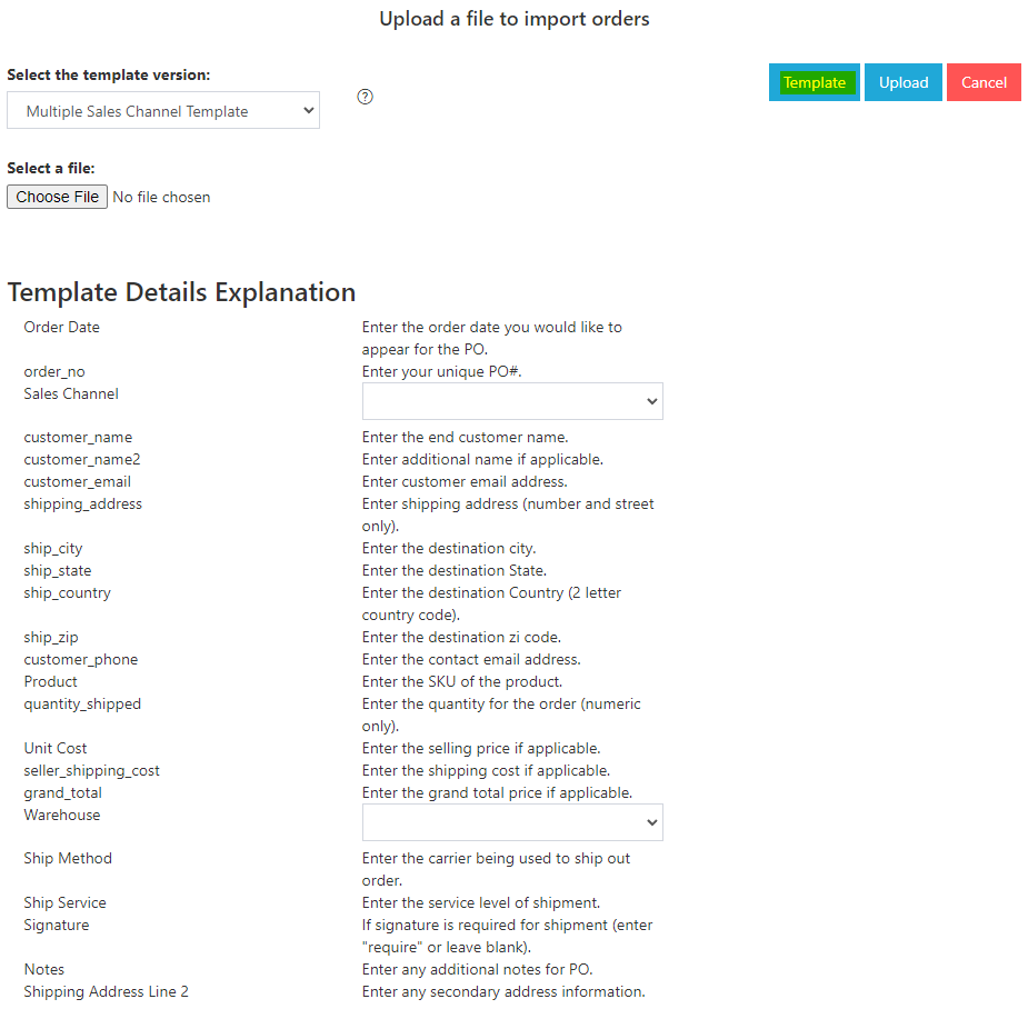 6.) Once you are done above, click “Template”, you may fill out all the details. Make sure to insert the codes of your “Sales Channel” and “Warehouse”. Once it is done, you may Upload the template upon selection of the file.