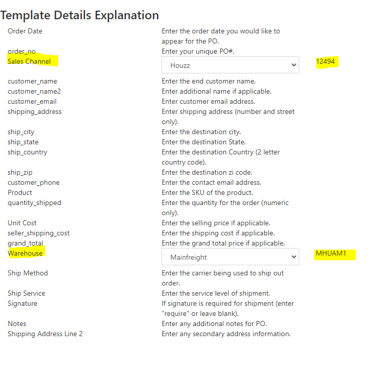 5.) Also, you can use below template information. Just click “Sales Channel” and select your preferred Sales Channel. The same with the “Warehouse”. You will notice on the right side that there are codes.