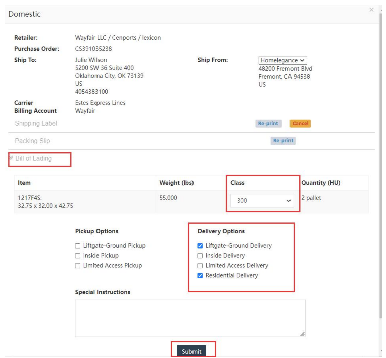 2.) Open “Bill of Lading”, select the “Freight Class”, and then select the “Delivery Options” that are needed. Finally click “Submit”, then your BOL will start to download.